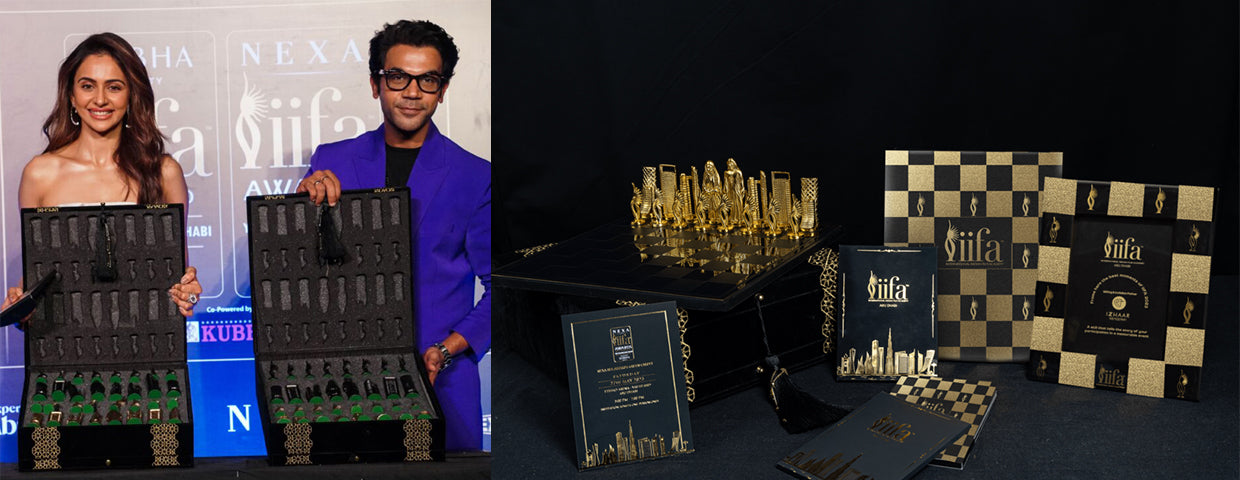 The magnificent metal chessboard symbolises the opulence of the UAE and the IIFA 2023 gala in Abu Dhabi, the country’s capital. This well-liked strategic game is made even more alluring by its striking black and gold appearance with an Izzhaar twist. Working on the designs and producing them in a short period of time is no easy task, but succeeding at it each time inspires Izzhaar to do even better. When you open the box, it leads you past Abu Dhabi’s famous sights while revealing the symbolic towers in the form of chess pieces.